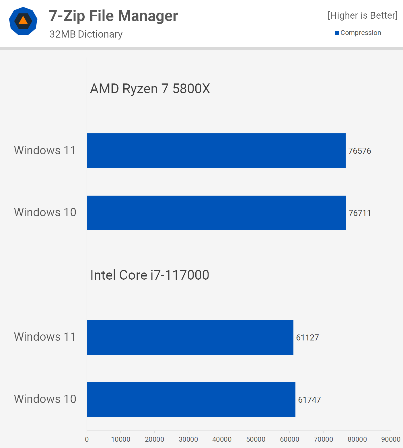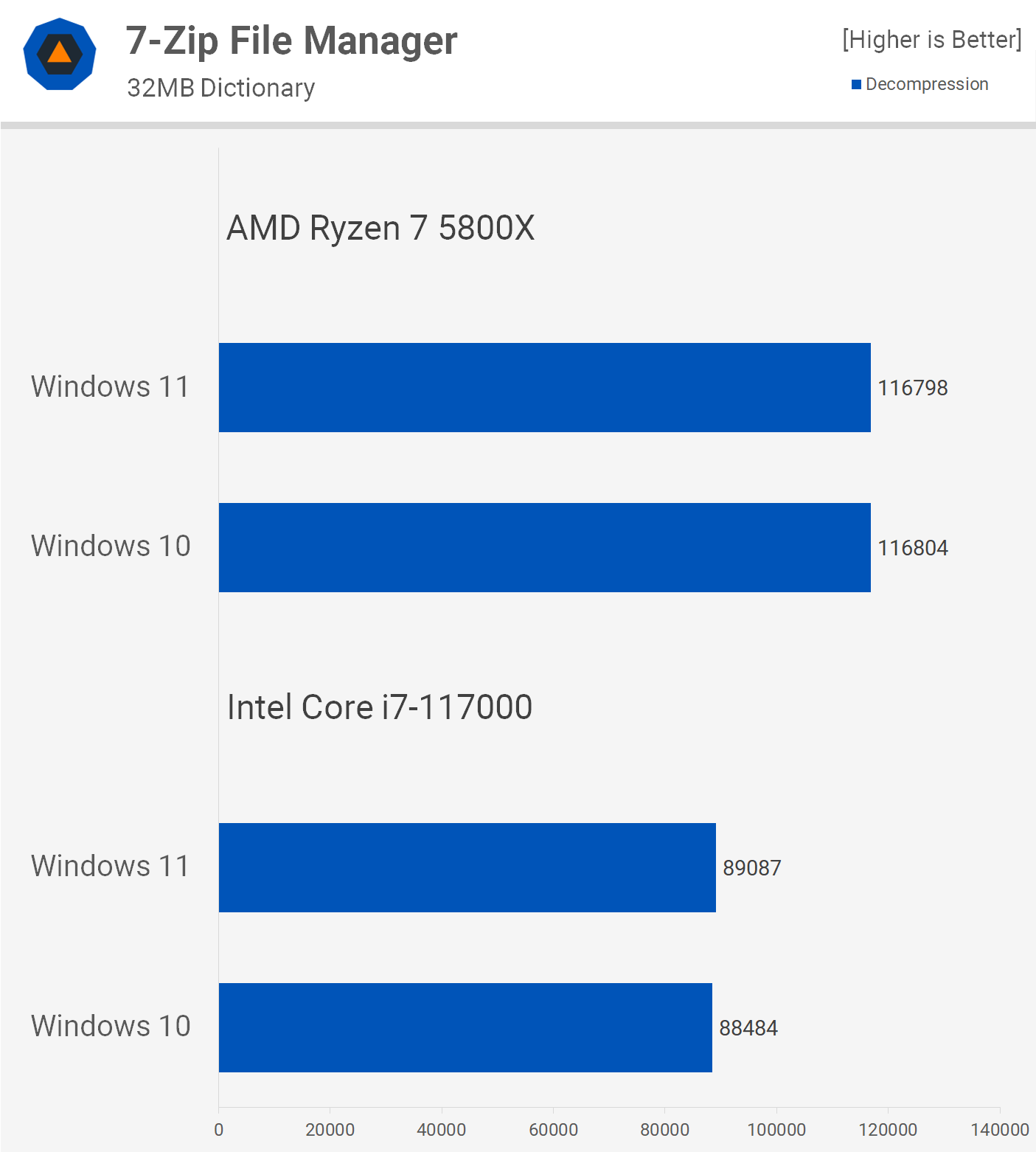 Running Cinebench R23 appears to reveal the exact same level of CPU performance for both Rocket Lake and Zen 3 processors. And 7-zip compression is no different. I'm not going to bother talking about most of the performance margins as they're insignificant. In the case of 7-zip, we're looking at no more than a 1% margin between the two Windows operating systems.