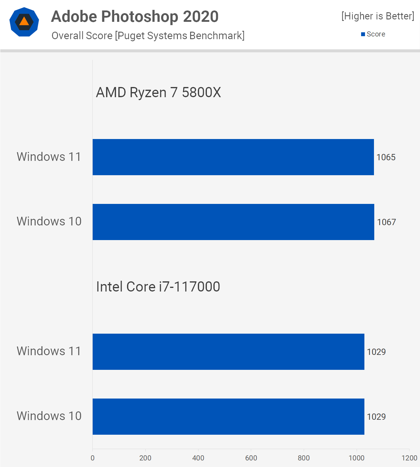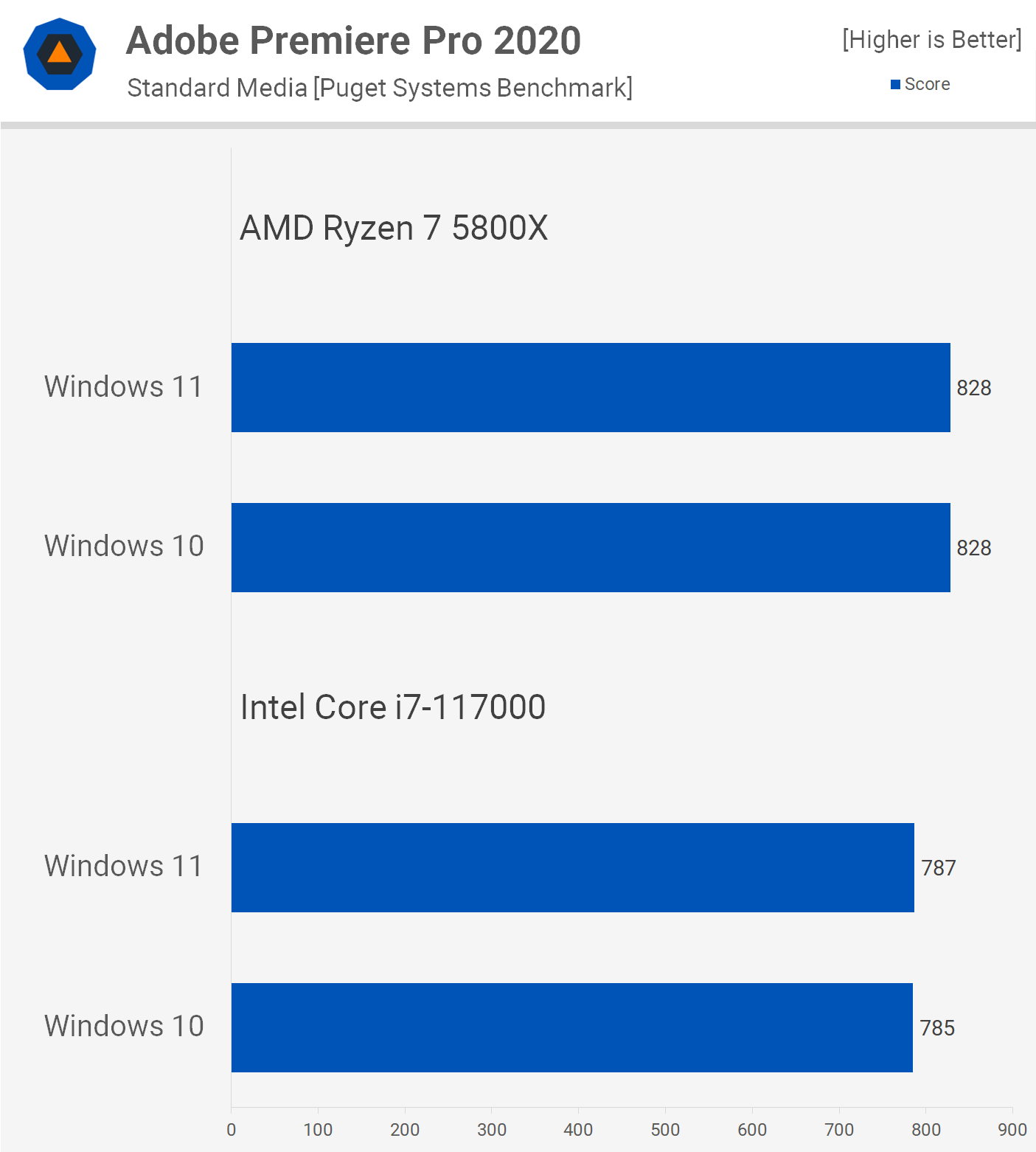 We see the same with Adobe software, doesn't matter if it's Photoshop, After Effects or Premiere Pro, we're looking at identical performance using either Windows 10 or Windows 11.