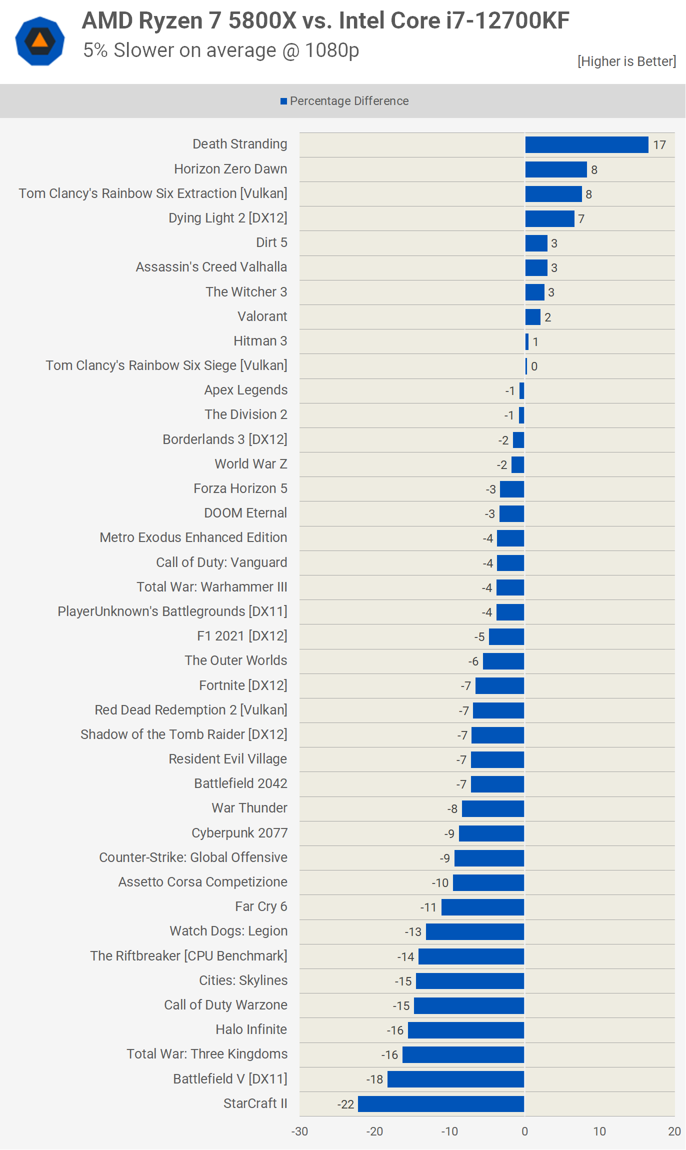 For those of you interested, the 5800X and 12700KF were evenly matched overall. The Ryzen 7 CPU was a bit slower, though only by a 5% margin on average. There were just 10 games where the 5800X was slower by a 10% margin or greater, and then just a single example where it was faster by a double digit margin (Death Stranding). Then there were 17 games where the margin between the two was 5% or less in either direction which we deem a tie.